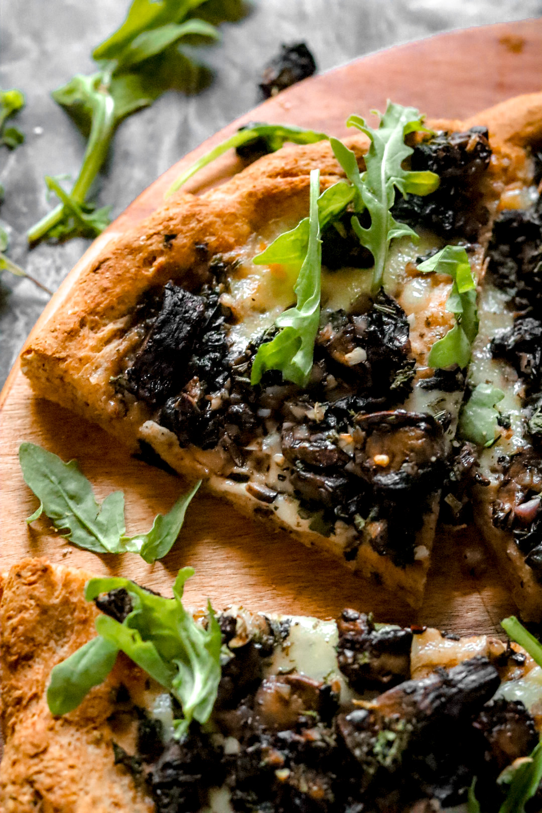 - Brush dough with 1 tablespoon olive oil. Spread mushrooms evenly over the crust, then distribute mozzarella overtop. Sprinkle with herb seasoning. Bake 15-18 minutes until cheese turns golden and is bubbly. To serve, top with fresh arugula, as desired.
