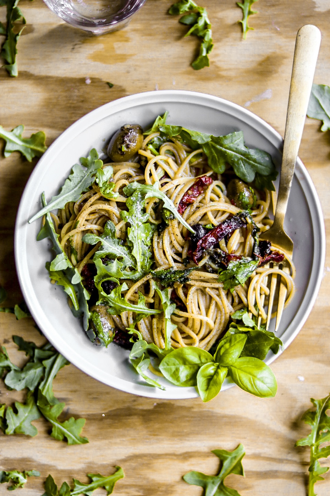 Speaking of – the fresh basil, parsley, and arugula marry with freshly grated parmesan only after the pasta is poured into the olive oil. This is where the good ole tongs come in. Flip and turn and shake the contents of the pan about, pouring dashes of pasta water in, until the consistency you like comes to fruition. Give the noodles a taste and add desired amount of salt and pepper.