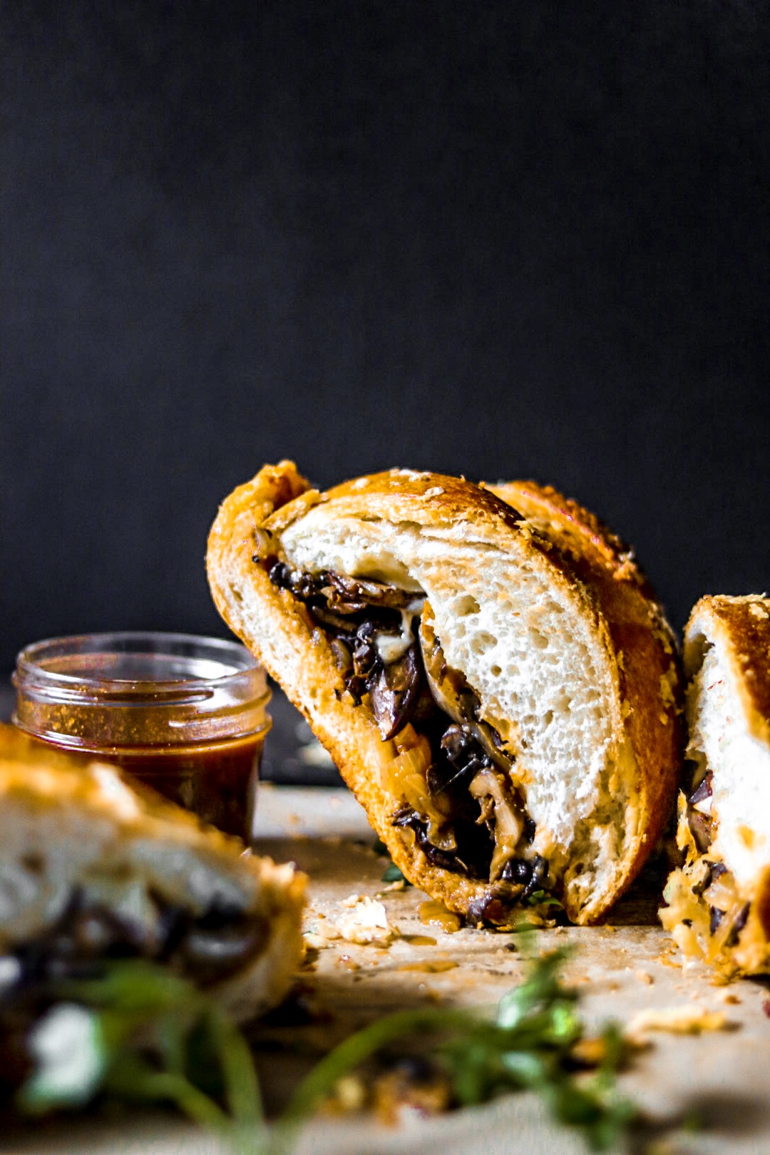 The longer you let your mushrooms and onions simmer, the deeper, richer, and thicker becomes the sauce. I support a 30+ minute cook time, but if you don’t have as many minutes to spare, 10-15 works well enough and you can leave the gravy in the pan while the sandwich bakes to create the thick end product perfect for dipping.