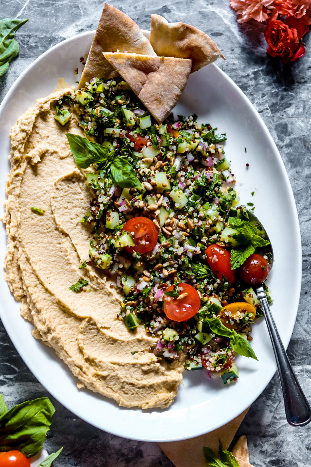 To present the platter, spread the hummus across the bottom. Spoon tabbouleh overtop. I added a few more halved cherry tomatoes for aesthetic.